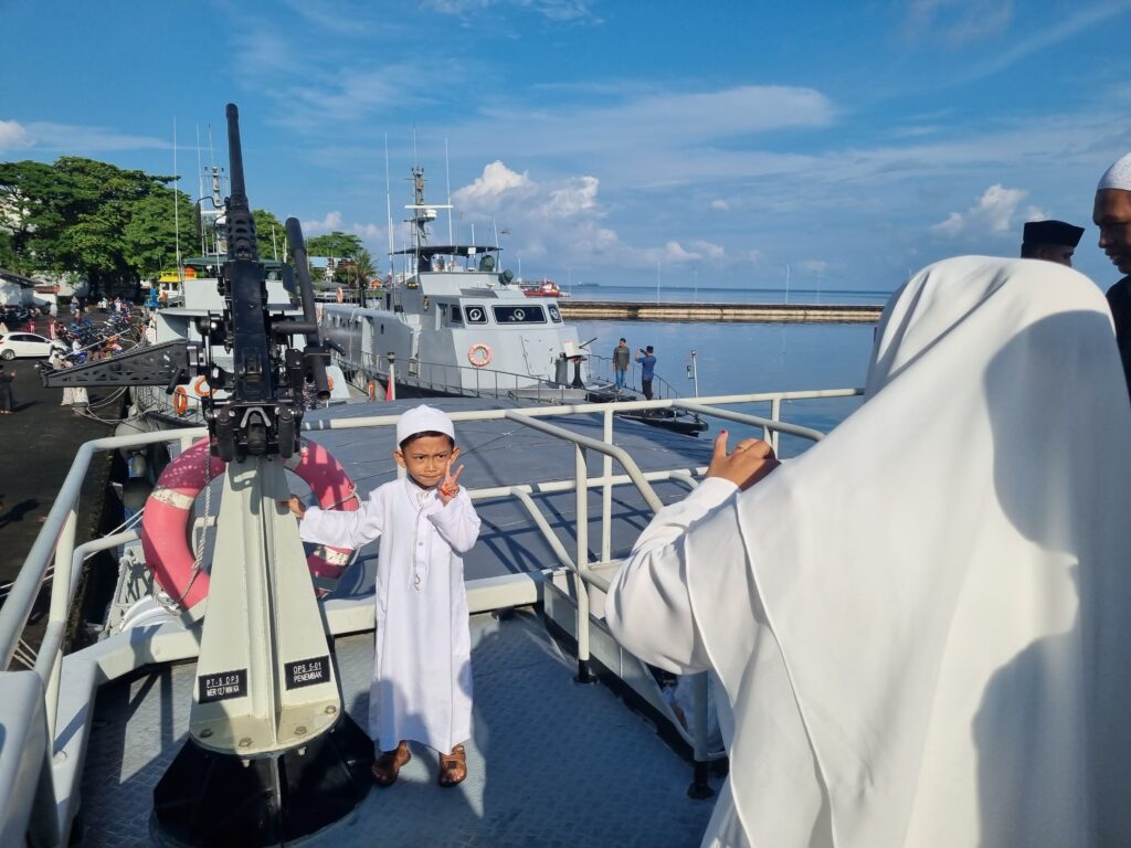 Nikmati Sensasi Lebaran di Atas Geladak Tempur Kapal Perang TNI AL, Warga Serbu KRI Usai Salat Idul Fitri di Mako Kodaeral VI