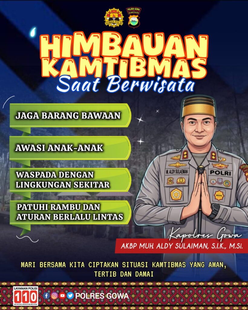 GOWA, EDELWEISNEWS.COM – Dalam rangka menjaga situasi keamanan dan ketertiban masyarakat (kamtibmas) selama libur Hari Raya Idul Fitri 1447 Hijriah, Kapolres Gowa AKBP Muhammad Aldy Sulaiman, S.I.K., M.Si menyampaikan imbauan kepada seluruh masyarakat yang memanfaatkan momen libur lebaran untuk berwisata, Selasa (24/3/2026). Imbauan tersebut disampaikan sebagai langkah preventif guna mengantisipasi potensi gangguan keamanan di tempat-tempat […]