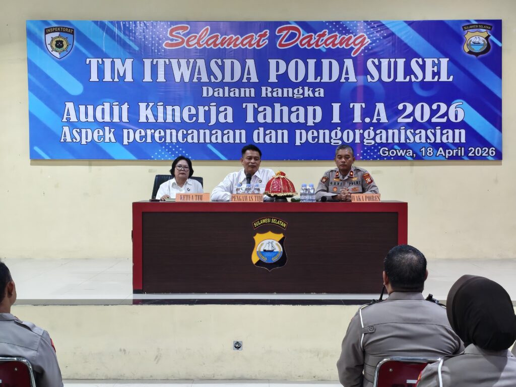 GOWA, EDELWEISNEWS.COM – Polres Gowa menerima kunjungan Tim Audit Kinerja Itwasda Polda Sulsel Tahap I T.A. 2026 dengan fokus pada aspek perencanaan dan pengorganisasian di lingkungan Polres Gowa dan Polsek jajaran, Sabtu (18/4/2026). Kegiatan audit tersebut dilaksanakan di Aula Rewako Wicaksana Laghawa Polres Gowa, dan dipimpin langsung oleh Pengawas Tim Kombes Polisi Budi Wahyono, S.H, […]