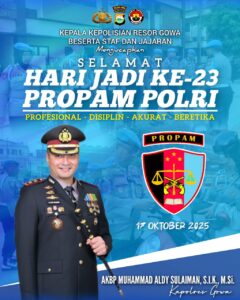 GOWA, EDELWEISNEWS.COM – Kepala Kepolisian Resor Gowa AKBP Muhammad Aldy Sulaiman, S.I.K., M.Si. beserta seluruh staf dan jajaran menyampaikan ucapan selamat Hari Jadi ke-23 Propam Polri, yang diperingati setiap tanggal 17 Oktober, Jum’at (17/10/2025). Dalam momentum bersejarah ini, Kapolres Gowa menyampaikan apresiasi atas dedikasi dan profesionalisme personel Divisi Profesi dan Pengamanan (Propam) Polri dalam menjaga […]