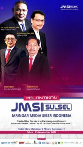 MAKASSAR, EDELWEISNEWS.COM – Persiapan pelantikan Pengurus Daerah (Pengda) Jaringan Media Siber Indonesia (JMSI) Provinsi Sulawesi Selatan periode 2025-2030 telah rampung. Prosesi pelantikan bakal dihelat di Hotel Claro, Jalan AP Pettarani, Makassar, Sabtu (15/11/2025). Kegiatan ini mengusung tema “Media Siber Pendorong Pembangunan Ekonomi Sulawesi Selatan yang Mandiri, Inklusif dan Berkelanjutan”. Tak hanya pelantikan, agenda ini juga […]