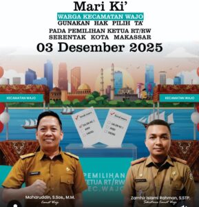 MAKASSAR, EDELWEISNEWS.COM – Camat Makassar Maharuddin, S.Sos, MM dan Sekcam Makassar Zamhir Islami Rahman, Stp mengajak warga untuk mensukseskan pemilihan Ketua RT/RW serentak di Kecamatan Wajo yang akan digelar pada tanggal 3 Desember mendatang. “Mari kita sukseskan Pemilihan Ketua RT/RW Kecamatan Wajo Kota Makassar Tahun 2025 yang akan berlangsung pada tanggal 03 Desember 2025 mendatang,” […]