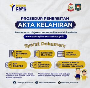 MAKASSAR, EDELWEISNEWS.COM — Dinas Kependudukan dan Pencatatan Sipil (Disdukcapil) Kota Makassar terus meningkatkan kemudahan akses layanan administrasi kependudukan bagi masyarakat. Salah satu layanan yang kini semakin praktis adalah penerbitan Akta Kelahiran, yang dapat diajukan sepenuhnya secara online melalui situs resmi www.dukcapil.makassarkota.go.id. Layanan berbasis digital ini dihadirkan untuk mempercepat proses penerbitan dokumen kependudukan serta meminimalkan antrean […]