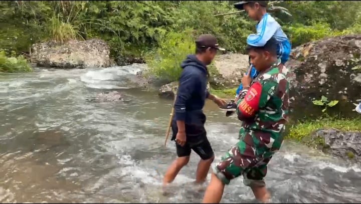 Sebagai aksi nyata di lapangan, Serda Suardi aktif membantu penyeberangan warga dan anak sekolah, memantau arus sungai, serta memberikan imbauan keselamatan saat debit air meningkat.