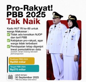 MAKASSAR, EDELWEISNEWS.COM – Di momentum kemerdekaan ini, Pemkot Makassar memastikan tarif Pajak Bumi dan Bangunan (PBB) tahun 2025 tidak naik. Keputusan ini diambil agar masyarakat tidak terbebani, sekaligus menunjukkan keberpihakan pemerintah kepada warganya. Pendapatan daerah tetap bisa dioptimalkan melalui pemutakhiran data. Misalnya tanah kosong yang kini sudah berdiri bangunan di masukkan dalam basis pajak, dengan […]