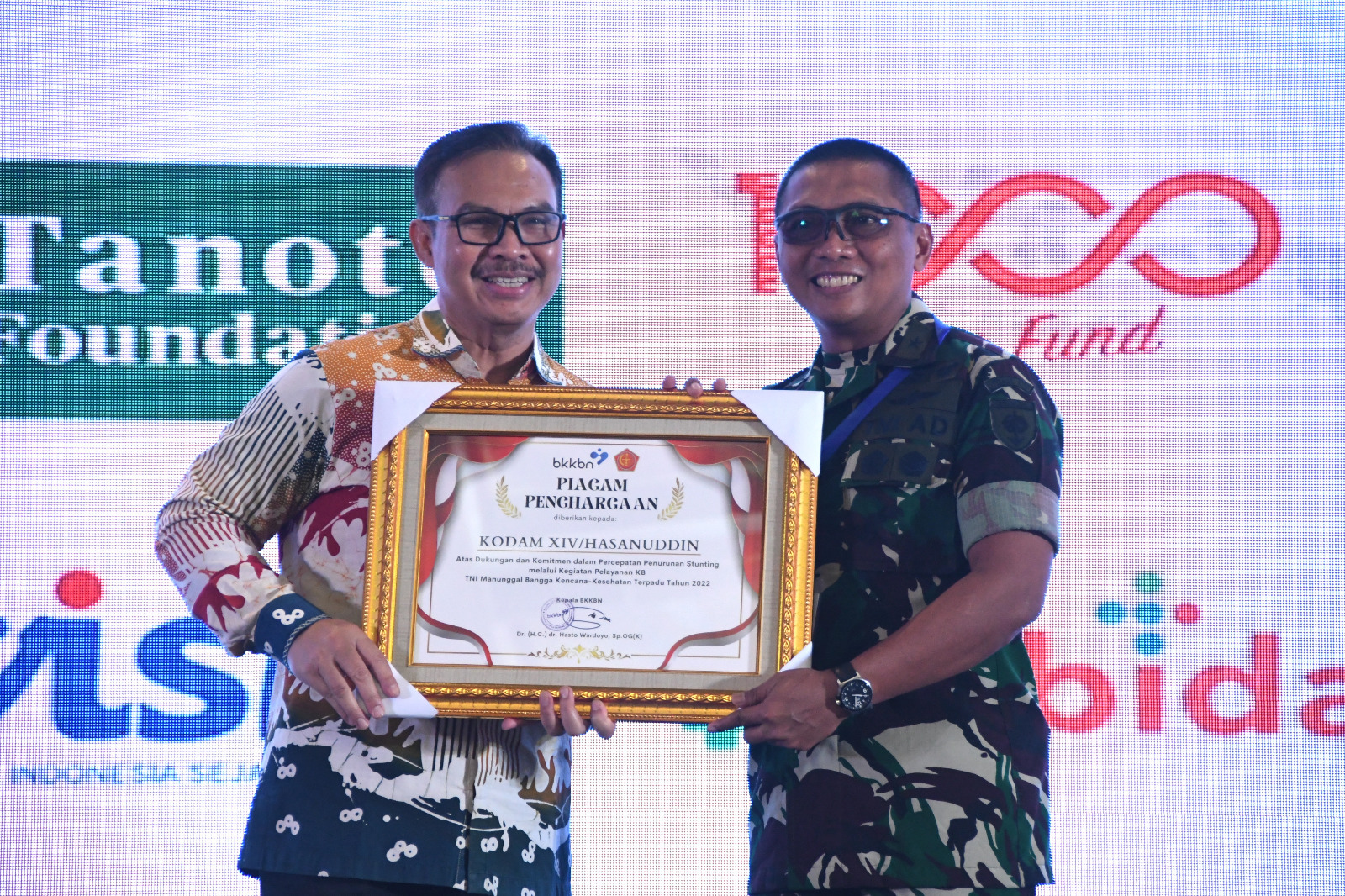 Penghargaan tersebut diberikan langsung oleh Kepala BKKBN dr. Hasto Wardoyo, Sp.OG (K) kepada Inspektur Kodam (Irdam) XIV/Hasanuddin Brigjen TNI Dwi Endrosasongko, S.Sos, disaat mewakili Kodam XIV/Hasanuddin mengikuti Rapat Koordinasi Teknis (Rakornis) Kemitraan 2023 yang dibuka oleh Menteri Koordinator Pembangunan Manusia dan Kebudayaan (Menko PMK) Muhadjir Effendy, bertempat di Hotel Grand Sahid Jaya di Jakarta, Selasa (7/3/2023).