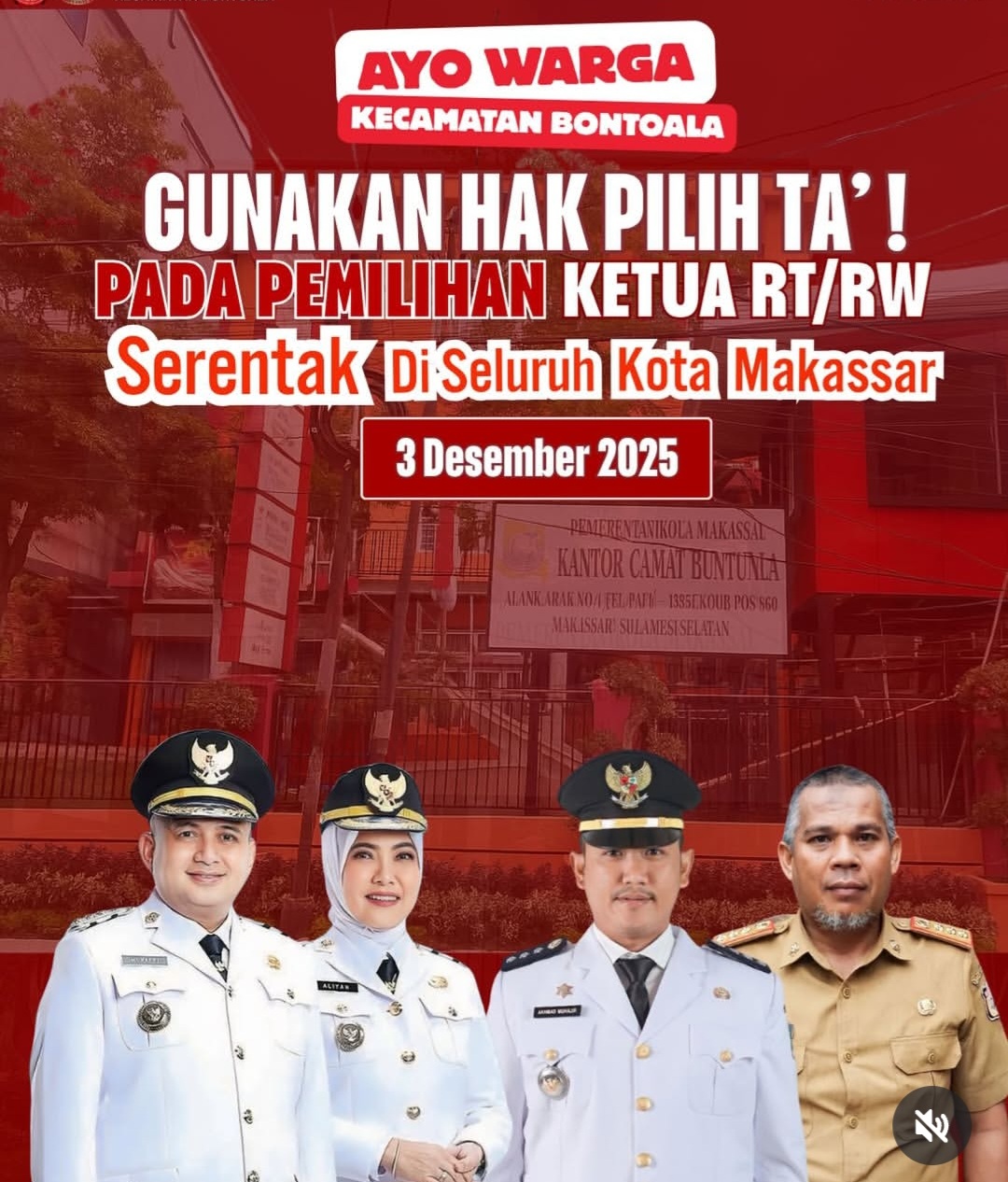 “Halo warga Kecamatan Bontoala, janganki lupa datang di Tempat Pemungutan Suara (TPS) tanggal 3 Desember mendatang. Gunakan hak pilihta’ untuk memilih ketua RT,” ajak Camat Bontoala sebagaimana dikutip dari akun IG Kecamatan_Bontoala, 25 November 2025.