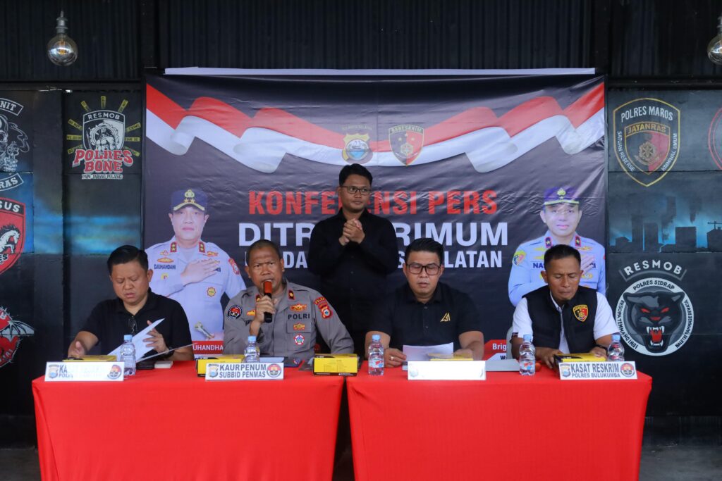 Konferensi pers tersebut dipimpin oleh Kasubdit 3 Jatanras Ditreskrimum Polda Sulsel, Kompol Benny Pornika, S.I.K., didampingi Kaur Penum Subbid Penmas Bidhumas Polda Sulsel, Kompol Andi Huseng, S.H., serta Kasat Reskrim Polres Bulukumba Iptu Muhammad Ali, S.Sos., dan Kasat Reskrim Polres Bantaeng AKP Gunawang Amin, S.H., M.Si.