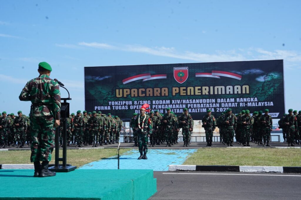 Upacara penyambutan berlangsung dengan khidmat dan dipimpin langsung oleh Pangdam XIV Hasanuddin Mayor Jenderal TNI Windiyatno. Sebanyak 350 prajurit Satgas Yonzipur 8/Sakti Mandra Guna personel yang terlibat dalam Satgas Pamtas Darat RI-Malaysia ini resmi mengakhiri penugasan mereka selama 13 bulan di wilayah perbatasan.