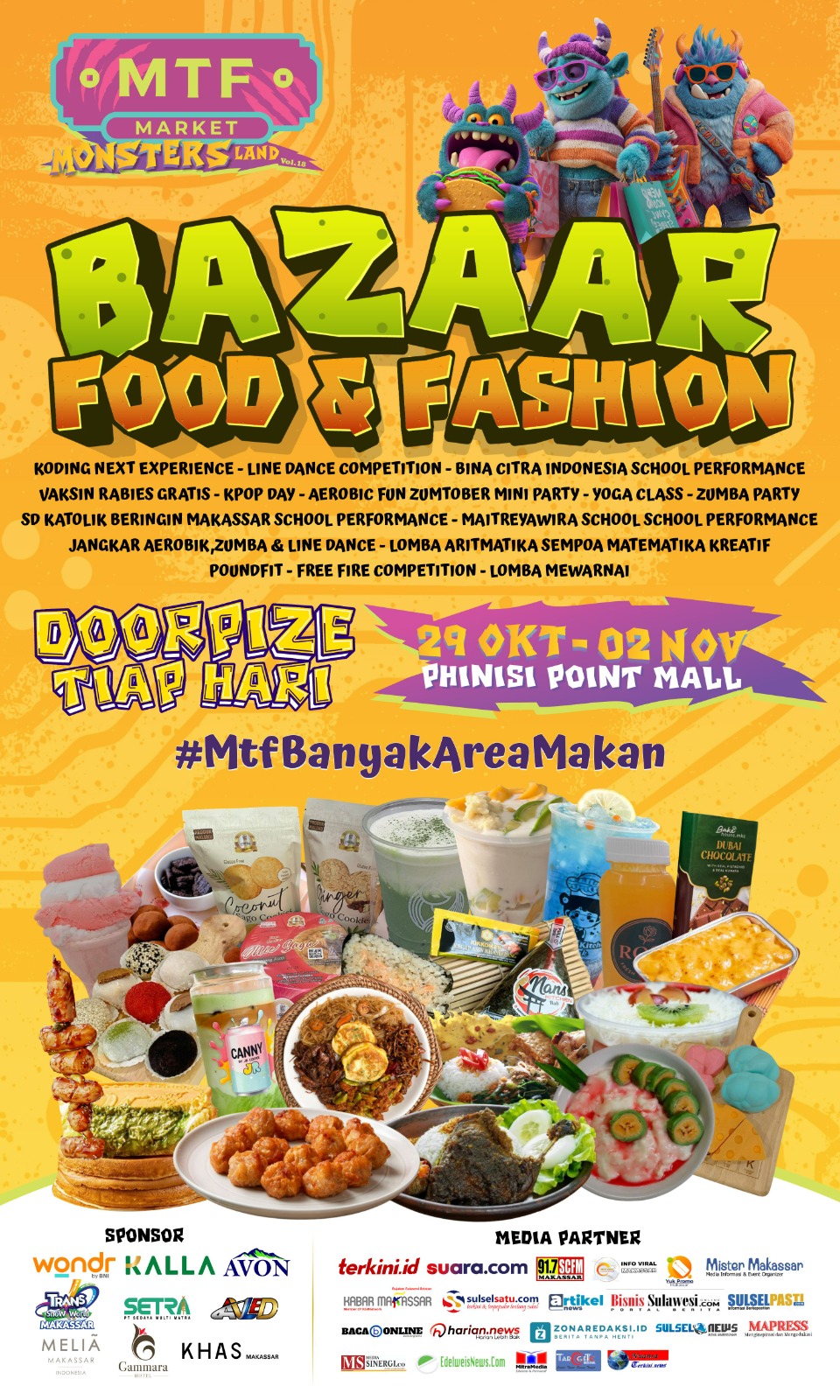 MAKASSAR, EDELWEISNEWS.COM – Setelah sukses dengan chapter sebelumnya, MTF Market kembali hadir dengan konsep baru yang lebih meriah: “Monster Land”. Festival kuliner dan fashion ini mewarnai liburan akhir bulan di Kota Makassar .mulai 29 Oktober 2025 di Phinisi Point (PIPO) Mall Makassar.