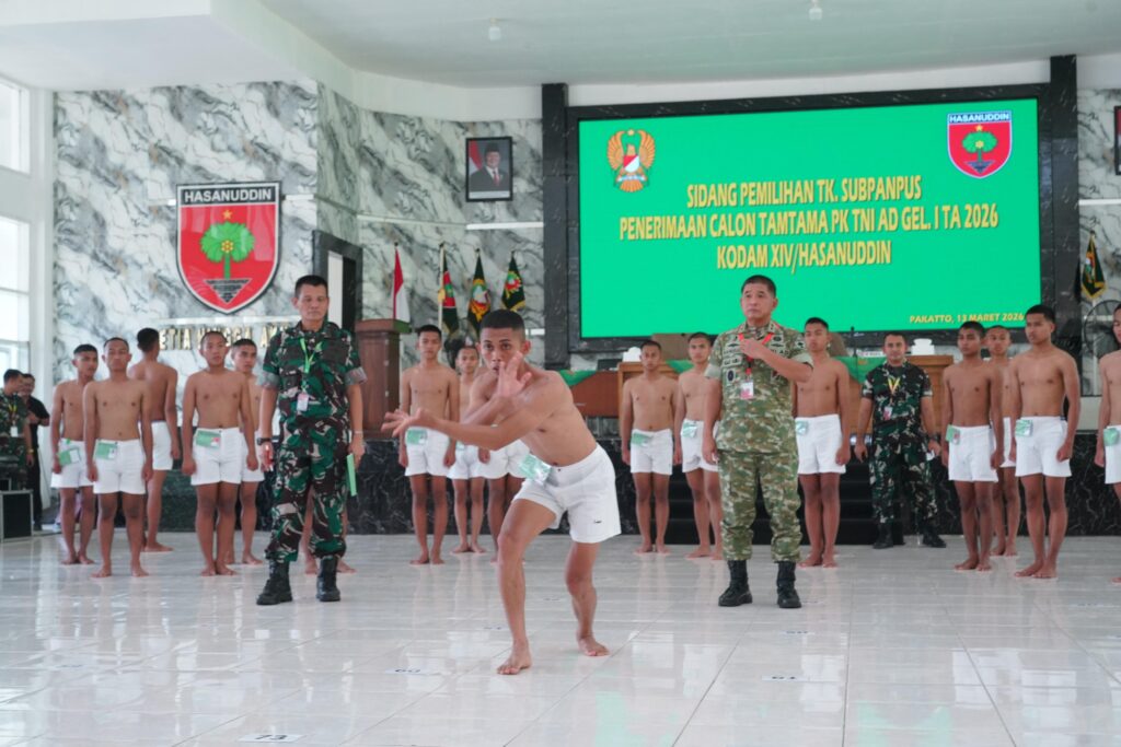 GOWA, EDELWEISNEWS.COM – Pangdam XIV/Hasanuddin Mayjen TNI Bangun Nawoko memimpin Sidang Pemilihan Tingkat Subpanpus Penerimaan Calon Tamtama (Cata) PK TNI AD Gelombang I Ta. 2026 Kodam XIV/Hasanuddin, bertempat di Aula Sudirman Rindam XIV/Hsn, Jalan Malino, Pakatto, Kab. Gowa, Jumat (13/3/2026).