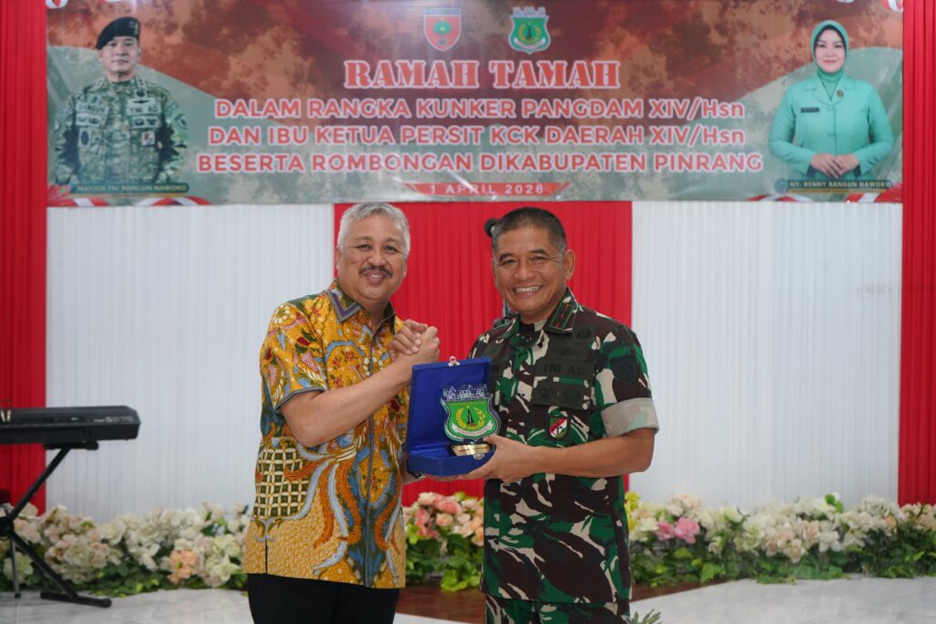 PINRANG, EDELWEISNEWS.COM – Guna mempererat hubungan silaturahmi serta sinergitas antara TNI dan pemerintah daerah, Pangdam XIV/Hasanuddin, Mayjen TNI Bangun Nawoko, didampingi Ketua Persit KCK Daerah XIV/Hsn dan sejumlah pejabat utama Kodam melaksanakan silaturahmi bersama Forkopimda Kab. Pinrang, bertempat di Rujab Bupati, Jalan Andi Makkulau, Kab. Pinrang, Rabu (1/4/2026).