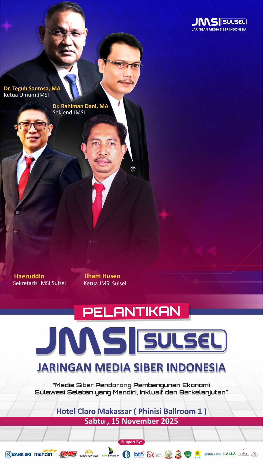 MAKASSAR, EDELWEISNEWS.COM – Persiapan pelantikan Pengurus Daerah (Pengda) Jaringan Media Siber Indonesia (JMSI) Provinsi Sulawesi Selatan periode 2025-2030 telah rampung. Prosesi pelantikan bakal dihelat di Hotel Claro, Jalan AP Pettarani, Makassar, Sabtu (15/11/2025).