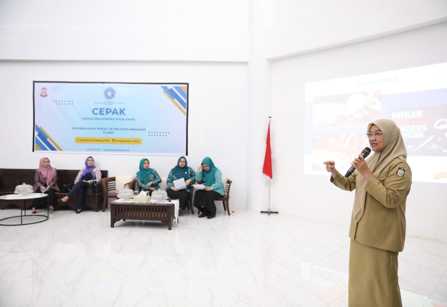 MAKASSAR, EDELWEISNEWS.COM.– Upaya menekan angka pernikahan pada anak, TP PKK Kota Makassar melalui Pokja I menggelar kegiatan sosialisasi Cegah Perkawinan Anak, berlangsung di Auditorium PKK, Selasa (16/9/2025).