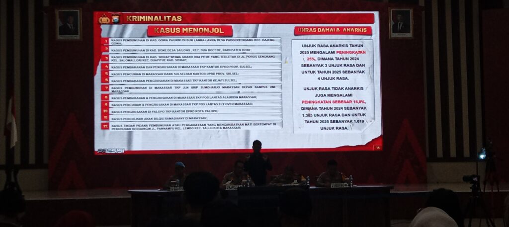 Press release akhir tahun ini bertujuan untuk menyampaikan laporan kinerja Polda Sulsel sepanjang tahun 2025, meliputi capaian pengungkapan kasus, evaluasi pelaksanaan tugas, situasi keamanan dan ketertiban masyarakat (kamtibmas), hingga berbagai prestasi yang berhasil diraih.