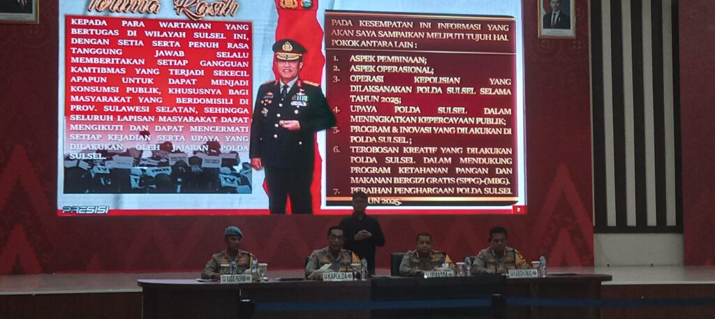 Kapolda Sulsel menjelaskan, bahwa informasi yang disampaikan dalam press release akhir tahun ini mencakup tujuh aspek utama, yaitu aspek pembinaan, aspek operasional, pelaksanaan operasi kepolisian sepanjang tahun 2025, upaya peningkatan kepercayaan publik, program dan inovasi Polda Sulsel, terobosan kreatif dalam mendukung program ketahanan pangan dan makan bergizi gratis, serta penghargaan yang diraih Polda Sulsel selama tahun 2025.