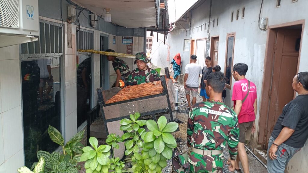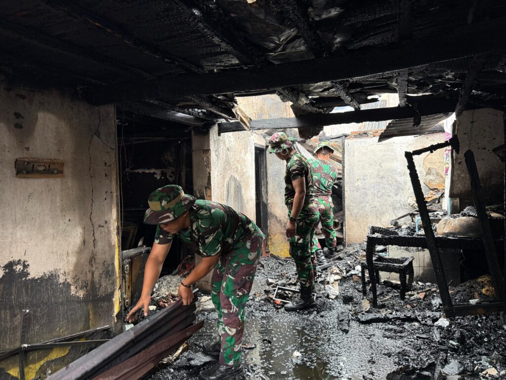 Para prajurit fokus membantu evakuasi barang milik warga dan pembersihan puing-puing bangunan yang hangus terbakar.