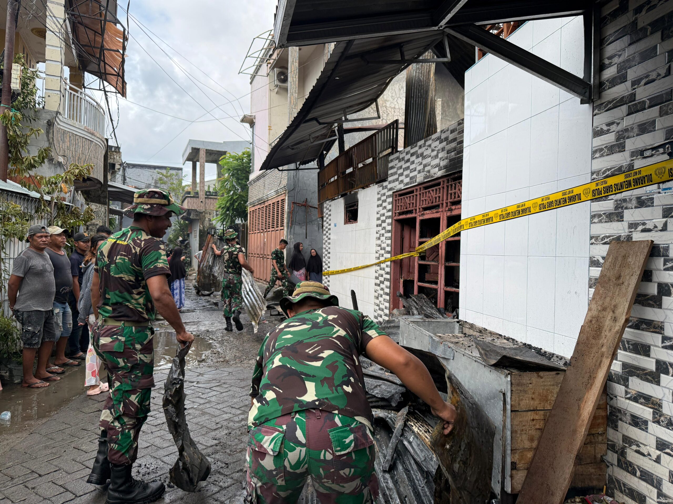 Para prajurit fokus membantu evakuasi barang milik warga dan pembersihan puing-puing bangunan yang hangus terbakar.