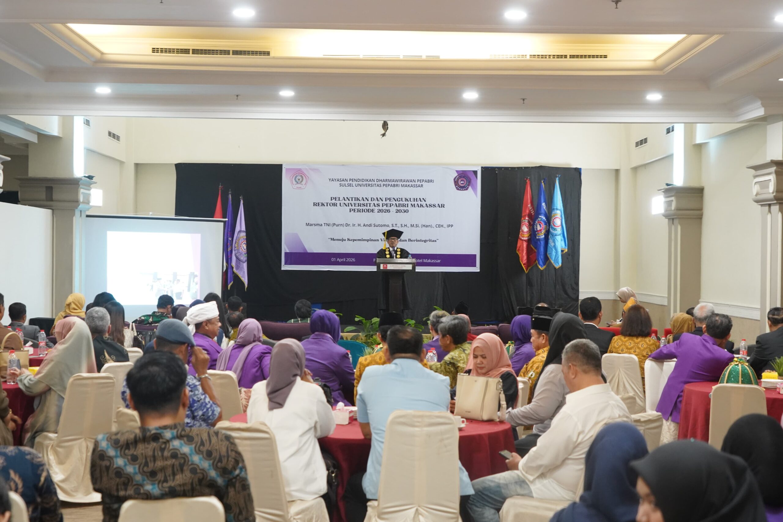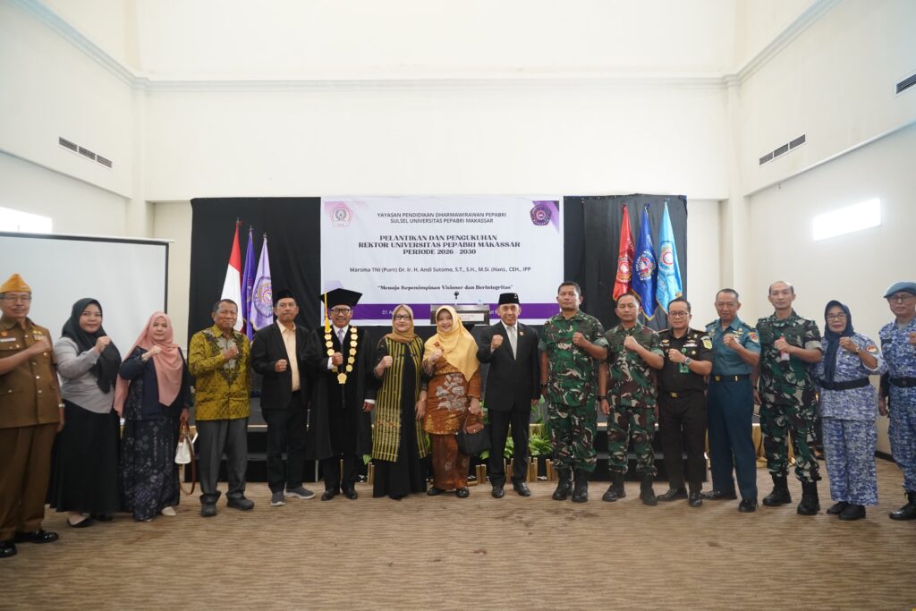 Dalam prosesi tersebut, Marsma TNI (Purn) Dr. Ir. Andi Sutomo, S.T., S.H., M.Si. (Han)., CEH., IPP., resmi dikukuhkan sebagai Rektor Universitas PEPABRI Makassar untuk periode 2026–2030.