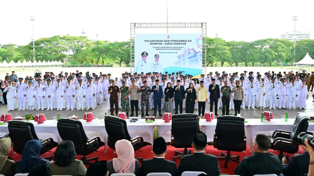 Prosesi pelantikan dan pengambilan sumpah/janji jabatan berlangsung di Tribun Lapangan Karebosi, Senin (29/09/2025), disaksikan jajaran Forkopimda dan pejabat lingkup Pemkot Makassar.